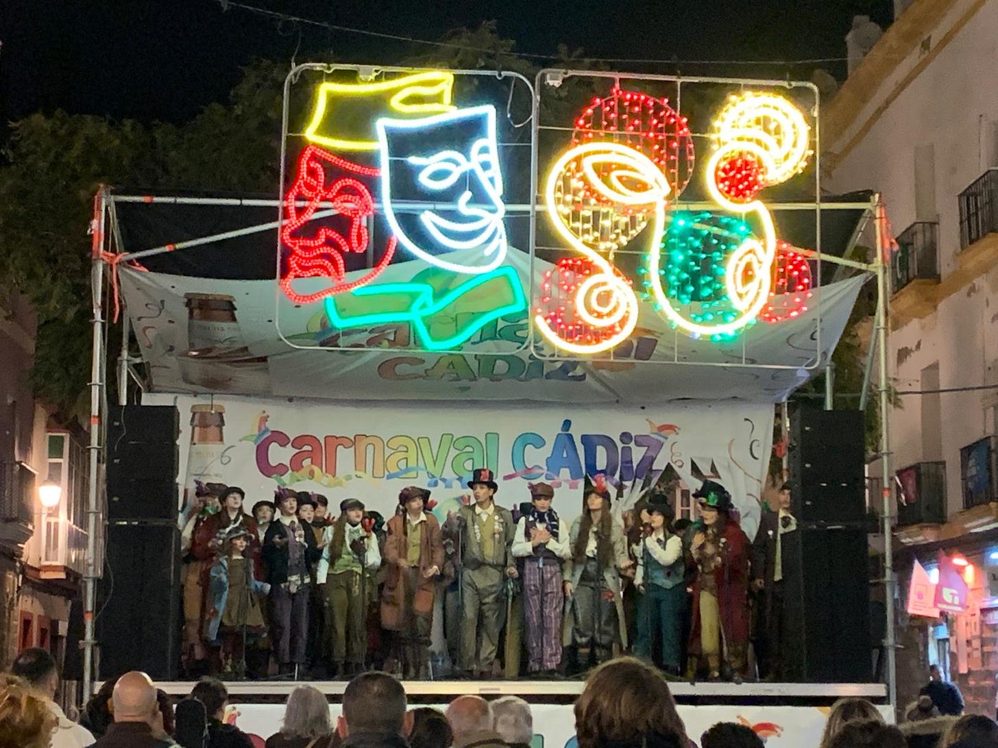 There are many parts to Carnaval—in the theatre, a series of food events, cabalgatas (parades), in the street and then Carnaval Chica, which happened after the official Carnaval ended. On January 10th the theatre portion started with 100s of groups of singers and performers competing at El Gran Teatro Falla de Cádiz to be featured during Carnaval in the streets. The theatre was built in the early 20th century and is a venue for music, theatre and dance. In January, every night was dedicated to the competition to be a part of Carnaval. Tickets sold out very quickly, but the local TV station, Onda Cádiz, live streamed them and they are available on YouTube to watch.