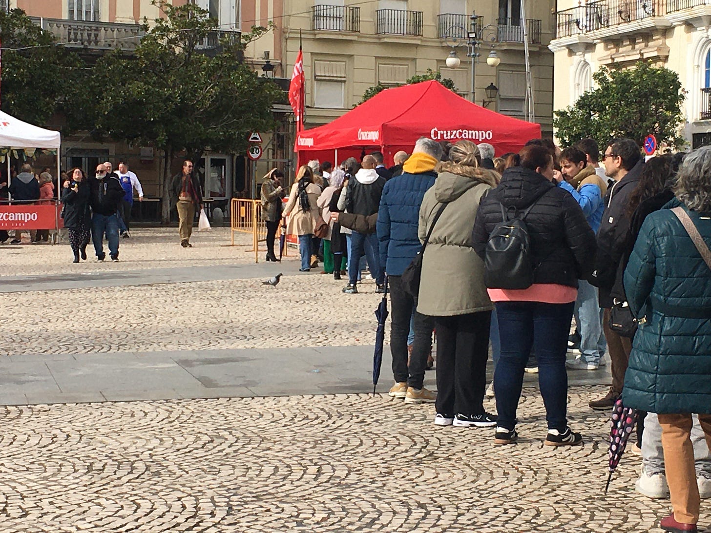 The gastronomical portion of Carnaval also started on January 10th, and for about a month free food (mainly seafood) and glasses of beer and fino (dry sherry) were handed out to people willing to wait in line. Each week was a different type of food and in a different location. We went to one, La Ostianada Popular, which was the oyster event. We waited about 20 minutes in the light rain for first one free oyster and a drink, and later two with a drink. We saw three choruses perform and the mayor, who lined up for an oyster with the rest of us, gave a short speech! There was also: La Pestinada Popular (pastries), La Mejillonada Popular (mussels), La Erizada Popular (raw sea urchin), La Gambada Popular (shrimp) and La Chicharronada Popular (pork).
